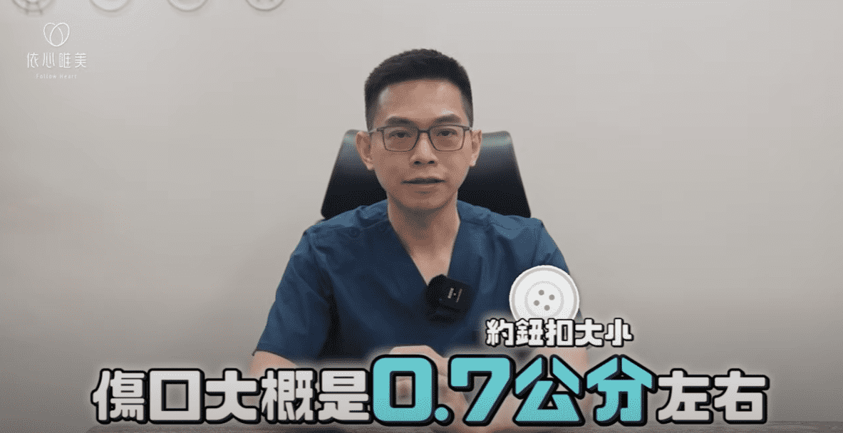 疤痕會隱藏在衣物遮蓋處,大約 0.7 公分,半年到一年左右會逐漸淡化。