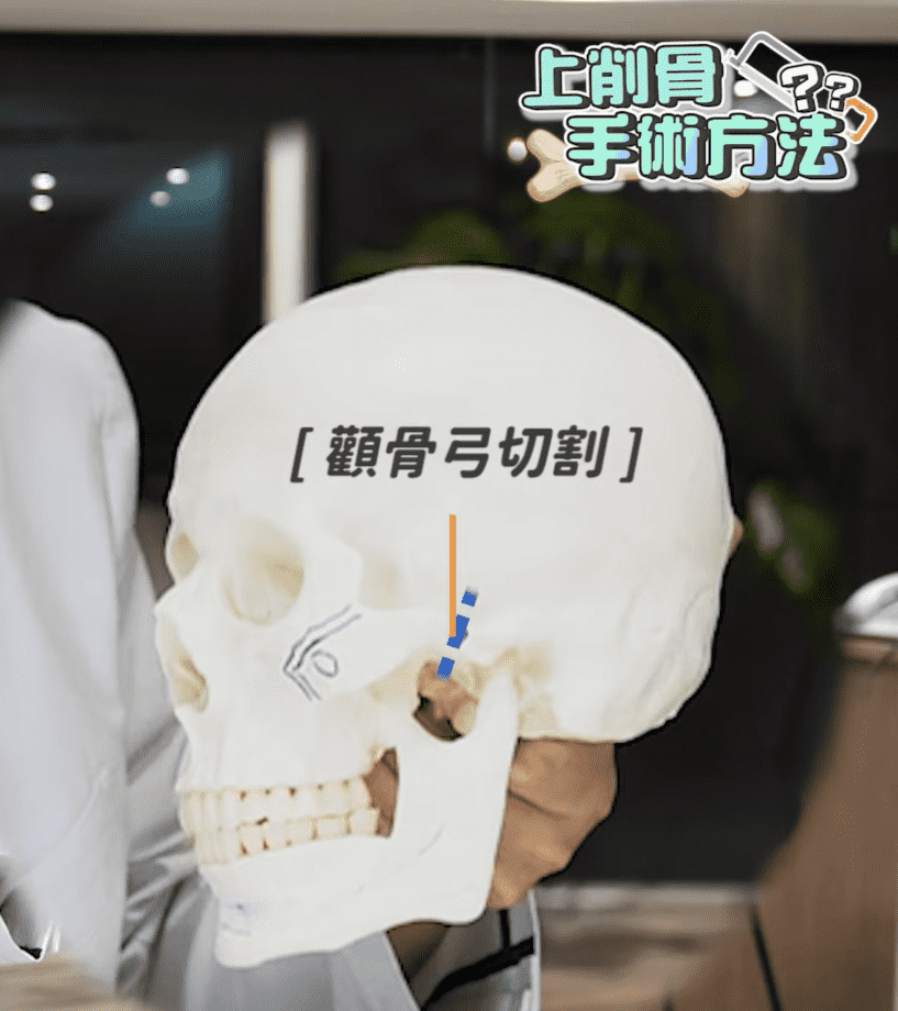 然後在顴骨弓的位置,也做切割的動作,所以這塊的骨頭會凸出來,但實際上我們會把它往內推,將L型拿掉後往內推。