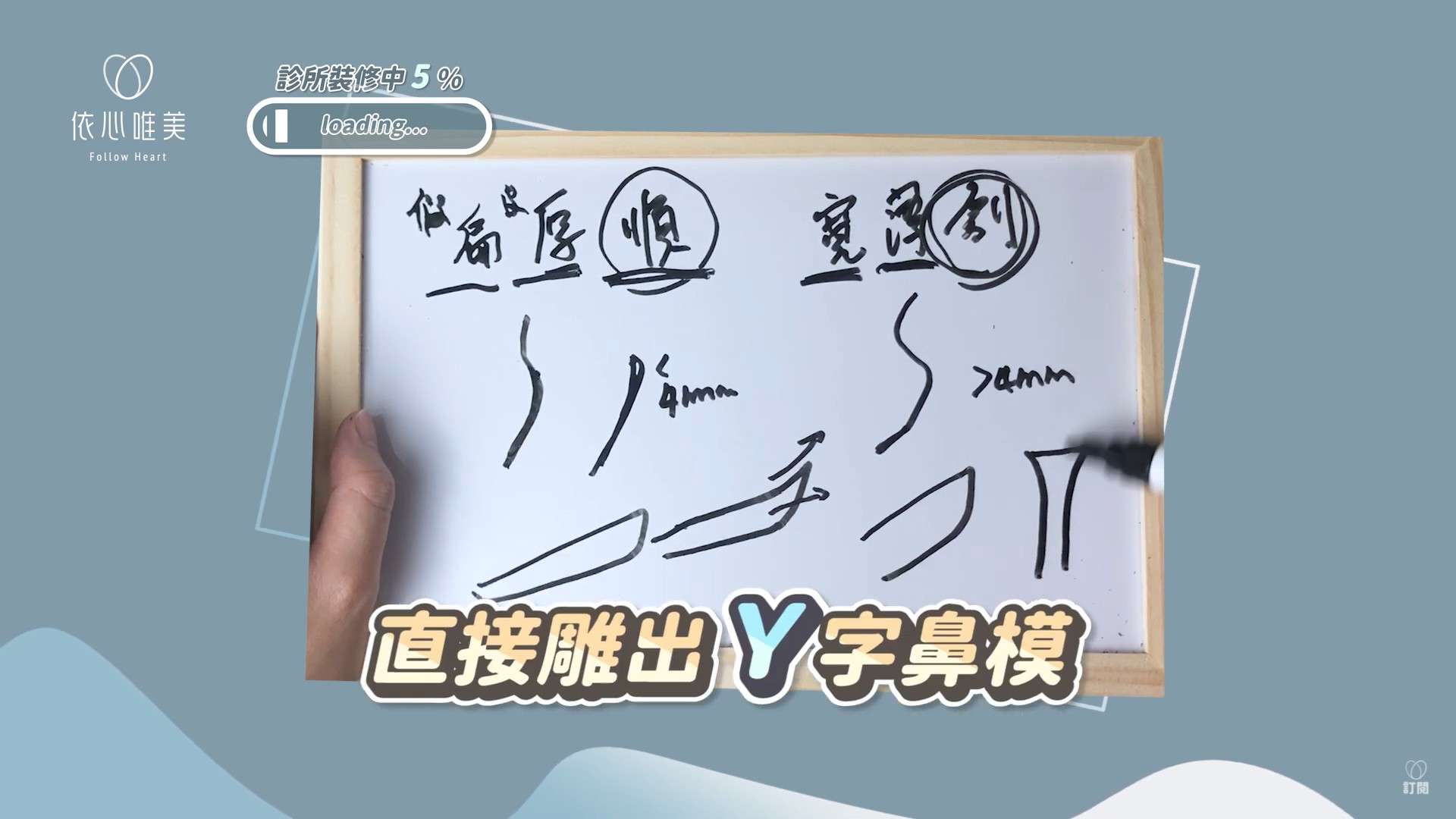 眉心跟山根落差很大、鼻子特別塌,這時就需要一個大於4mm的厚度的鼻模。但是皮膚因為很薄,所以放了人工材質後,假體的邊緣會形成「斷層感」,很難自然的順出那個延伸感,此時我們就要用「創造」的方式形成Y字眉心。