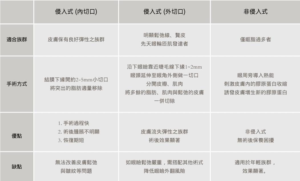 眼袋治療分為「侵入式」與「非侵入式」。侵入式眼袋治療,也就是我們常見的眼袋手術,眼袋手術再依切口位置分為內/外切口;