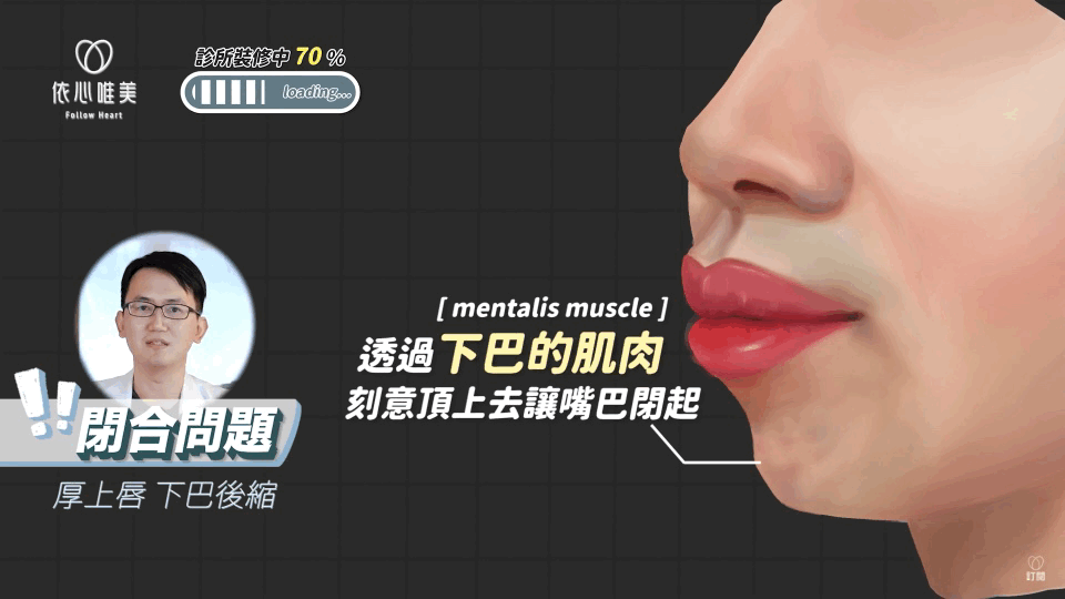 我們東方人其實有牙齒前凸跟下巴後縮的問題,這樣的結構會衍伸出閉合問題。就是嘴巴放鬆的時候會開開的,想要閉起來卻閉不太起來,要透過下巴的肌肉,也就是mentalis muscle,刻意出力頂上去,嘴巴才閉的起來。也因為長期用肌肉力量閉合,嘴唇就慢慢代償性的變厚。