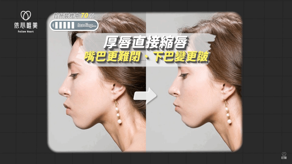 各位可以想像人體讓嘴唇變厚方便我們嘴巴閉合,如果任意讓嘴唇變薄,會更閉不起來。嘴巴要閉合時,嘴唇雖然變薄、變好看了,嘴巴卻更難合起來,因此下巴的肌肉需要更出力,才閉能順利閉合,也會造成下巴的皮膚皺折變多。整體下巴會看起來更後縮,臉型反而會更不協調。