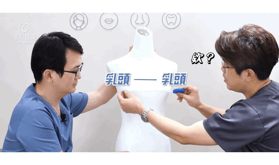 .是不是對稱型的胸廓 我們會測量從鎖骨的凹陷到達乳頭的距離,與左右乳頭之間的距離,判斷是不是對稱的胸型。 有些客人可能會有高低胸的狀況,或是兩側不對稱,在做假體隆乳手術時,就會特別做一些調整。